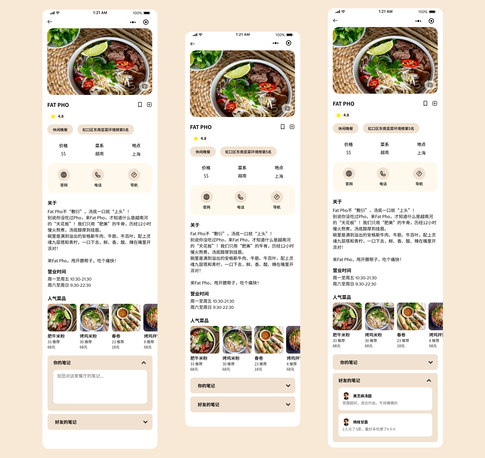 The expanded personal notes section prioritizes user-generated content creation, encouraging diners to document their experiences immediately after visiting. The prominent placement above friends' notes signals that personal reflections are valued equally alongside social recommendations. These screens demonstrate a layered approach to restaurant discovery that prioritizes genuine user experiences over commercial content. By giving equal visual weight to personal notes and friends' reviews, the design encourages honest documentation and creates a reliable knowledge base.