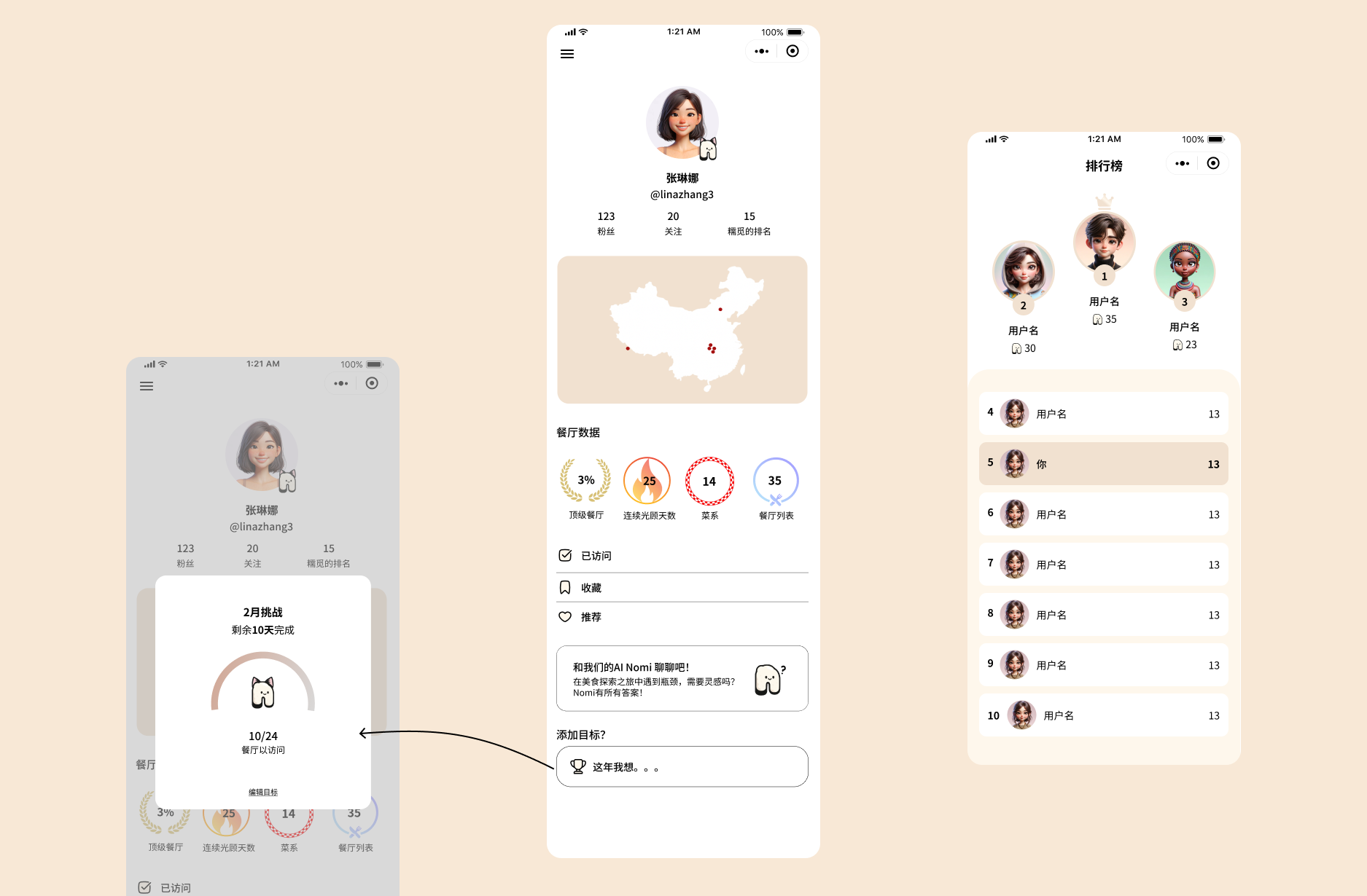 The general profile of the user displays a map of places visited, which creates a more emotional attachment to the platform and interacting with it. The monthly challenge creates a gamification loop that encourages exploration—users are motivated to visit new restaurants to complete the x-restaurant goal. The circular stats badges visualize dining diversity in an engaging, achievement-oriented way. Following this is the leaderboard, which fosters friendly competition and community engagement through social gamification. Unlike ad-driven platforms where engagement metrics might be inflated, these gamification elements are tied to authentic actions (actually visiting restaurants, trying new cuisines). The "已访问" (Visited) checkmark system creates accountability—users can't fake their way up the leaderboard.