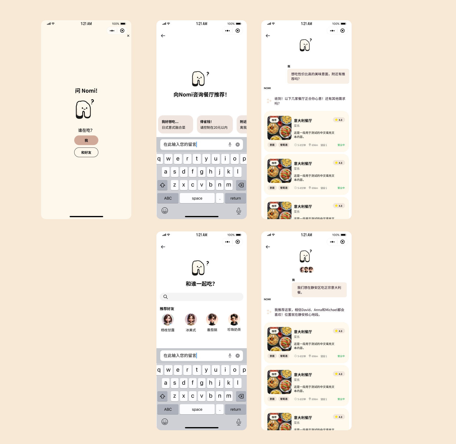 That's right, "What do you want to eat?" To help with this decision paralysis and fatigue, Nomi AI is incorporated into the system, where you are able to tell it what you want and they recommend based off of who you want to eat with and what you want to eat. When making group recommendations, Nomi explicitly states whose preferences were considered ("David, Anna, and Michael will all like it"). This transparency builds trust in the AI's reasoning rather than presenting recommendations as black-box outputs.